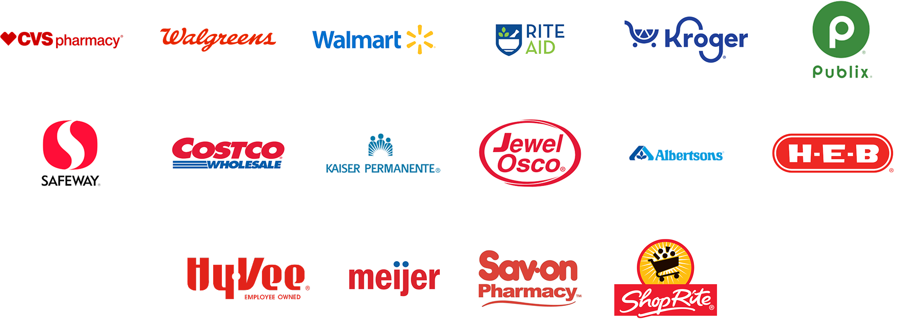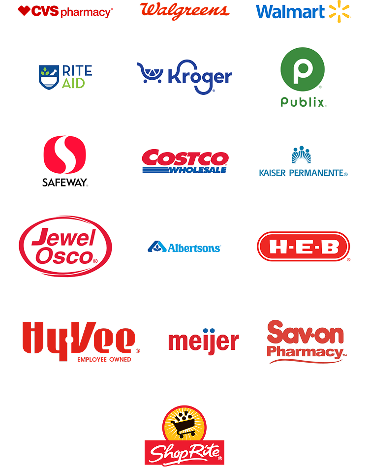 Our discounts are accepted at over 60,000 participating pharmacies, including: CVS, Walgreens, Walmart, Rite Aid, Kroger, Albertsons, Costco, Publix and many more!